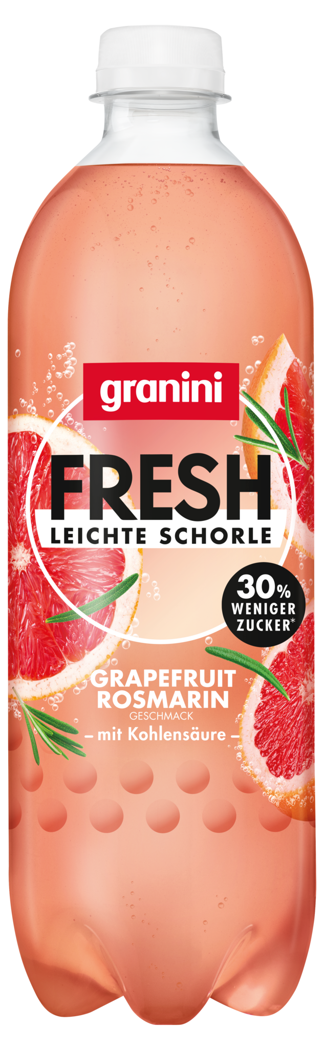 granini FRESH Grapefruit-Rosmarin bietet ein unvergleichbares Geschmackserlebnis aus saftiger Grapefruit, natürlichem Mineralwasser und Rosmarin-Aroma. Zudem ist granini FRESH mit weniger als 15kcal/100 ml kalorienarm und enthält keine künstlichen Süßungsmittel - aber trotzdem leckeren Fruchtsaft in gewohnter granini Qualität. Noch nie war viel trinken so einfach! granini FRESH ist ein toller Durstlöscher für alle Aktivitäten - ob beim Entspannen zuhause oder für neuen Schwung zwischendurch. Mit dem modernen To-Go Gebinde ist granini FRESH auch perfekt für unterwegs geeignet. Genieße den leichten Erfrischungs-Kick und bringe fruchtige Abwechslung in deinen Alltag. granini FRESH gibt es auch in zwei weiteren leckeren Sorten, so ist für jeden Geschmack etwas dabei. Auch für Veganer ist granini FRESH das ideale Getränk - denn bei der Herstellung von granini FRESH werden keine Gelatine oder sonstigen Inhaltsstoffe tierischen Ursprungs verwendet. Freu dich auf lecker-leichten Fruchtgenuss und greif zu granini FRESH Grapefruit-Rosmarin!