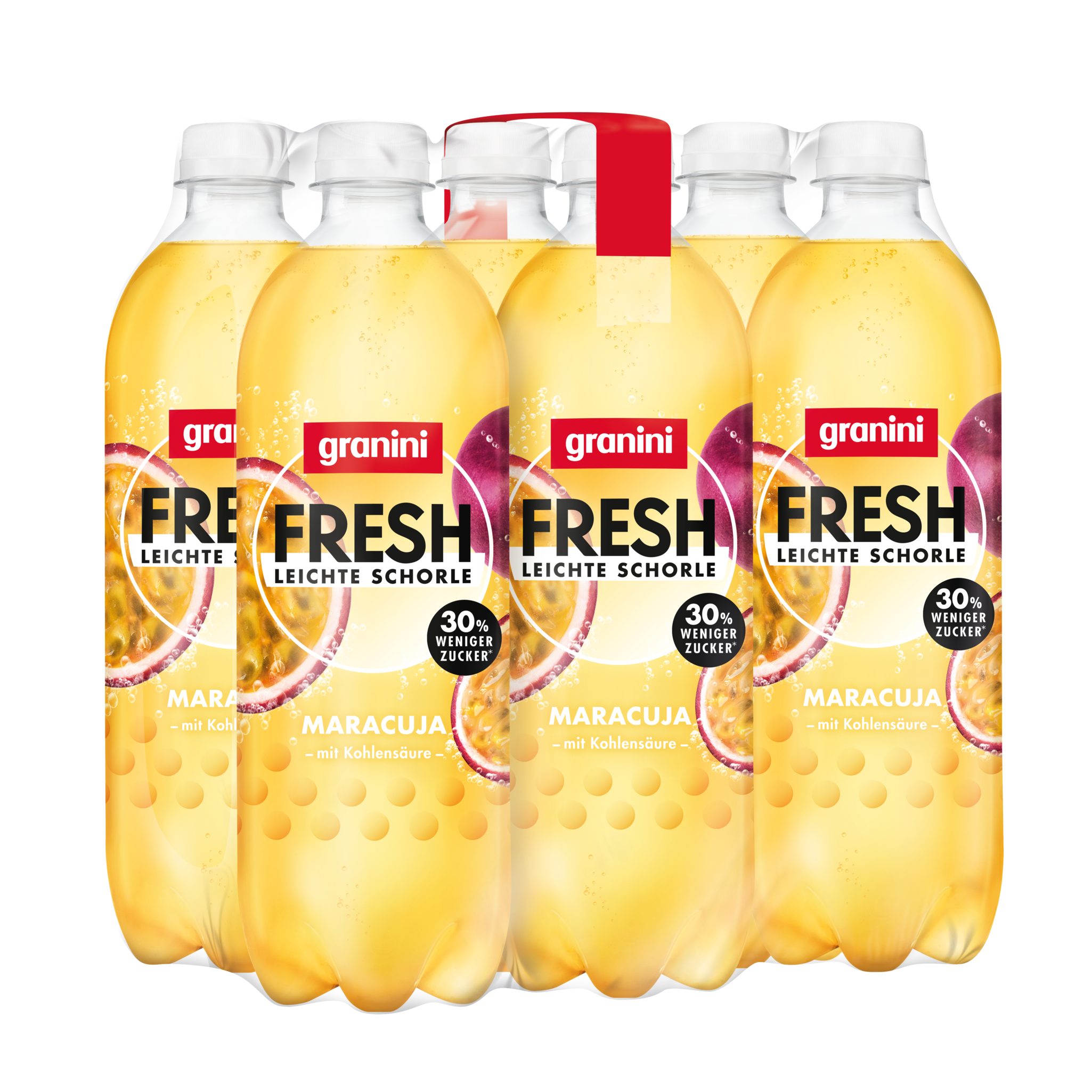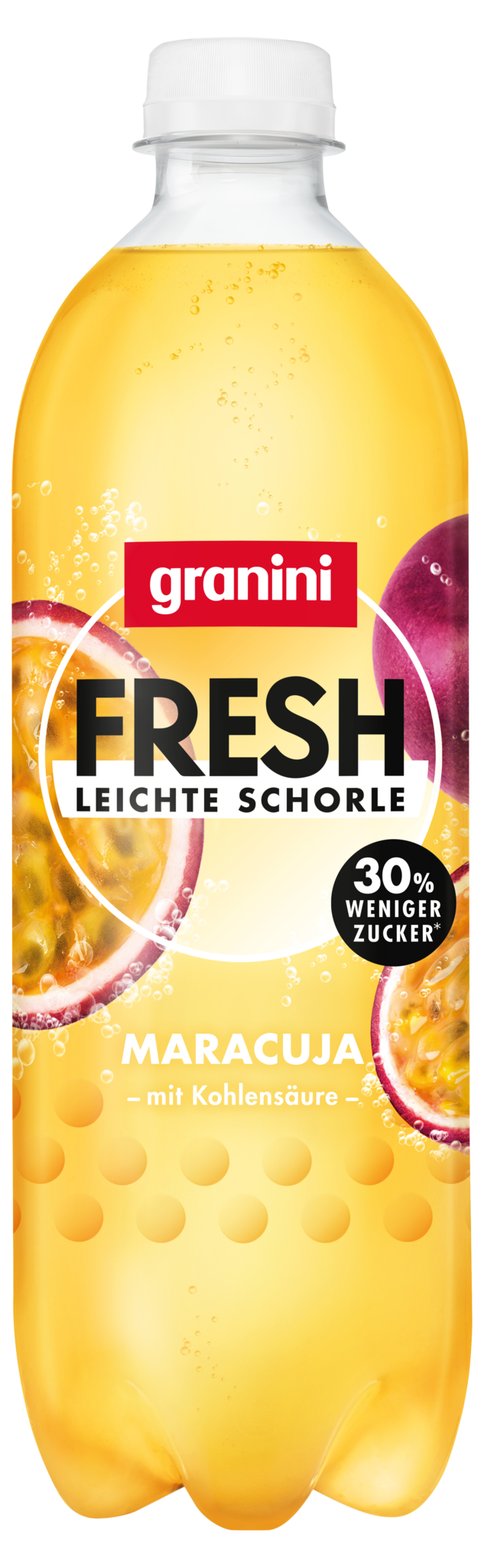 granini FRESH Maracuja bietet ein unvergleichbares Geschmackserlebnis aus exotischer Maracuja und natürlichem Mineralwasser. Zudem ist granini FRESH mit weniger als 15kcal/100 ml kalorienarm und enthält keine künstlichen Süßungsmittel - aber trotzdem leckeren Fruchtsaft in gewohnter granini Qualität. Noch nie war viel trinken so einfach! granini FRESH ist ein toller Durstlöscher für alle Aktivitäten - ob beim Entspannen zuhause oder für neuen Schwung zwischendurch. Mit dem modernen To-Go Gebinde ist granini FRESH auch perfekt für unterwegs geeignet. Genieße den leichten Erfrischungs-Kick und bringe fruchtige Abwechslung in deinen Alltag. granini FRESH gibt es auch in zwei weiteren leckeren Sorten, so ist für jeden Geschmack etwas dabei. Auch für Veganer ist granini FRESH das ideale Getränk - denn bei der Herstellung von granini FRESH werden keine Gelatine oder sonstigen Inhaltsstoffe tierischen Ursprungs verwendet. Freu dich auf lecker-leichten Fruchtgenuss und greif zu granini FRESH Maracuja!