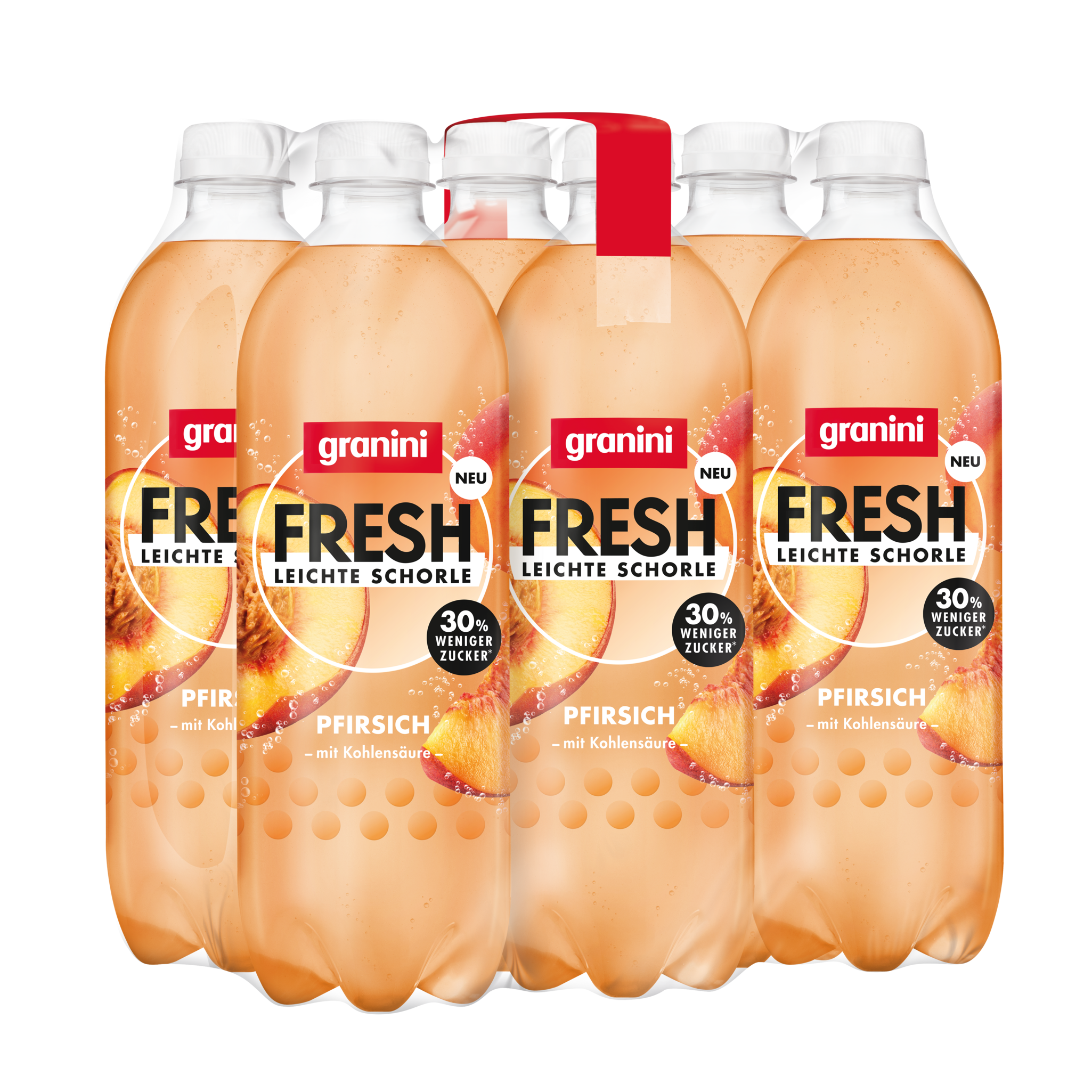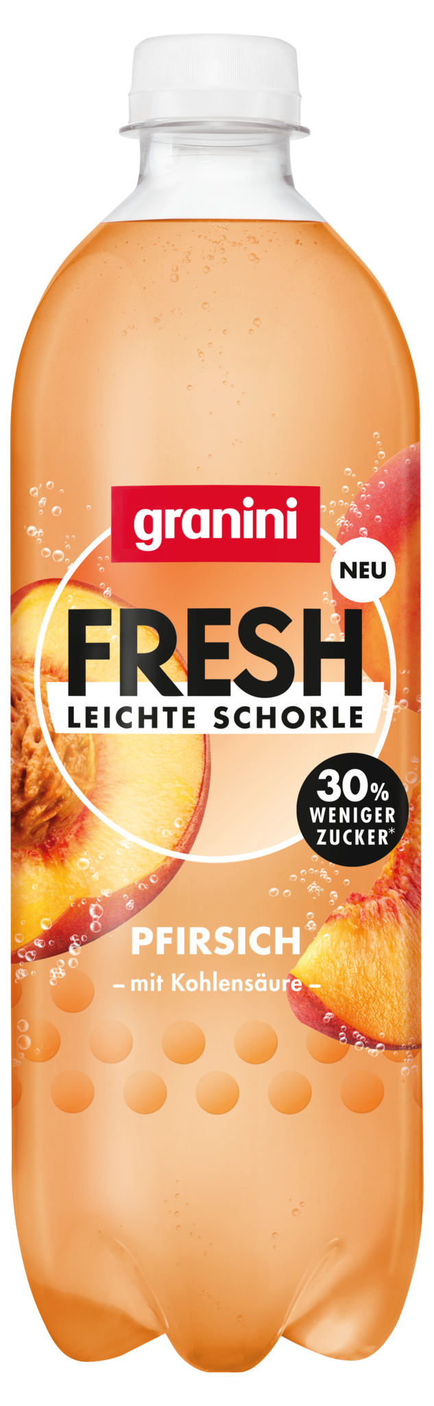 granini FRESH Pfirsich bietet ein unvergleichbares Geschmackserlebnis aus saftiger Pfirsich und natürlichem Mineralwasser. Zudem ist granini FRESH mit weniger als 15kcal/100ml kalorienarm und enthält keine künstlichen Süßungsmittel - aber trotzdem leckeren Fruchtsaft in gewohnter granini Qualität. Noch nie war viel trinken so einfach! granini FRESH ist ein toller Durstlöscher für alle Aktivitäten - ob beim Entspannen zuhause oder für neuen Schwung zwischendurch. Mit dem modernen To-Go Gebinde ist granini FRESH auch perfekt für unterwegs geeignet. Genieße den leichten Erfrischungs-Kick und bringe fruchtige Abwechslung in deinen Alltag. granini FRESH gibt es auch in zwei weiteren leckeren Sorten, so ist für jeden Geschmack etwas dabei. Auch für Veganer ist granini FRESH das ideale Getränk - denn bei der Herstellung von granini FRESH werden keine Gelatine oder sonstigen Inhaltsstoffe tierischen Ursprungs verwendet. Freu dich auf lecker-leichten Fruchtgenuss und greif zu granini FRESH Pfirsich!